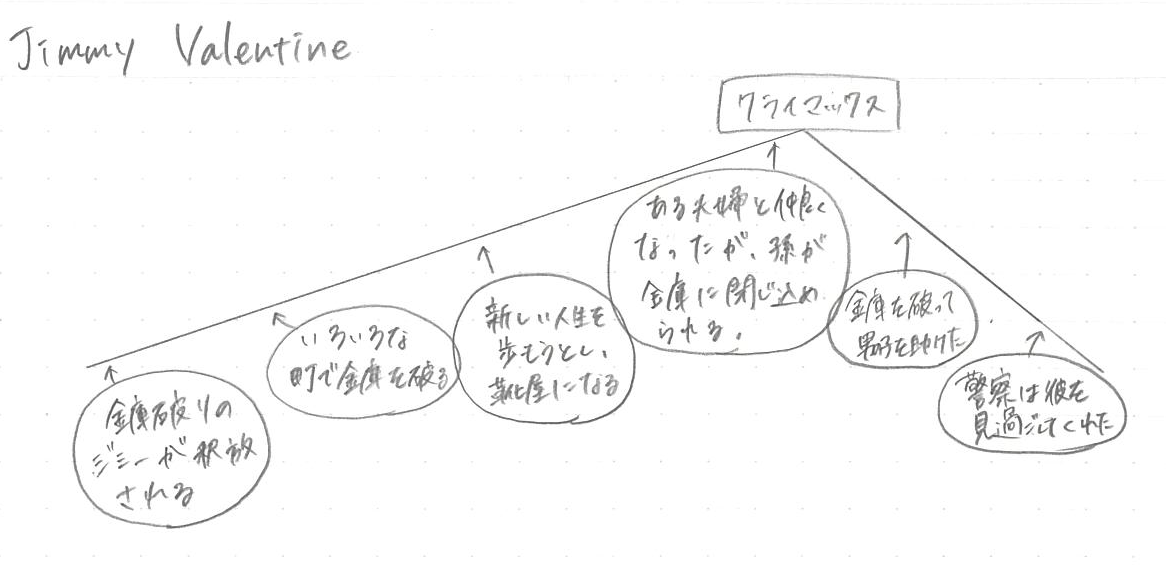 このようにまとめさせると英文として理解できているかどうかだけでなく、話全体をどのように理解しているかを見ることができます。しかしこれはIのフェーズです。大事なことは理解してそのあとの授業展開です。この話は上記に示したような話なのですが、Cフェーズでは「あなたがこの主人公ならどうしましたか」ということについて考えを交流し、Eフェーズでは、警官が主人公を見逃すのですが、「Do