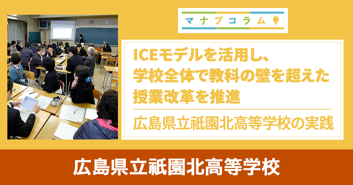 広島県立祇園北高校では、主体的・対話的で深い学びのある授業を実践しようと、学習・評価方法の1つである「ICEモデル」を取り入れ授業改善を進めている。当初は新たな取り組みに戸惑う教員が多かったが、今では教科を超えて授業改善の議論がなされるほどになった。教員にどのように浸透を図っていったのか、また、具体的にどのような授業が行われているのか。同校の教員に話を聞いた。(2019年2月取材)