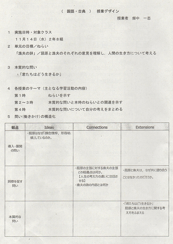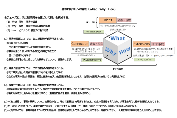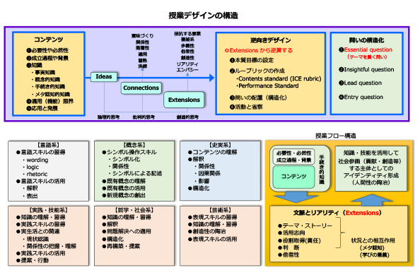 授業で発する問いも、逆向きの配置を基本としている。例えば、日本史の授業で、テーマを「産業革命と帝国主義はどのような関係にあり、それが現在の日本にどのような影響を与えているのか」と設定した時、「産業革命」「帝国主義」がI(アイデア)、「どのような関係」がC(コネクション)、「どのような影響」がE(エクステンション)になる。
