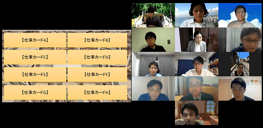 参加者を4人ずつに振り分けて、全部で5社を結成。ゲームの説明が終わると、会社ごとにブレイクアウトルームに分かれて、まず役割を分担。社長がメインルームで「仕事カード」を購入している間、メンバーが自己紹介をし、ゲームの進め方を確認した。そして、メインルームから社長が「仕事カード」を持ち帰り、商品となる情報の条件を伝えると、ゲームが始まった。
