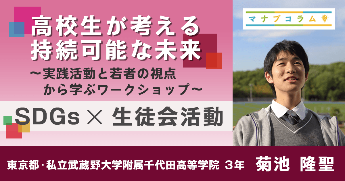 Goals)とは、「誰一人取り残さない」という理念のもと、2030年までに持続可能でよりよい世界の実現を目指す国際目標であり、2015年9月に国連サミットで採択された。その目標を達成するためには、大人だけでなく、未来を支える子どもも当事者意識を持って行動する必要がある。そうした意識を子どもが持つためには、学校でどのような教育を行うべきだろうか。今回、現役高校生の菊池隆聖さんが、自身の高校での生徒会活動や留学経験を生かし、教育関係者にSDGs教育を提案するワークショップを行った。