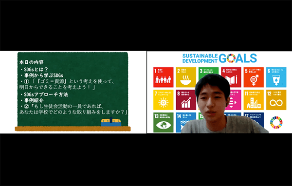 菊池さんは、文化祭や体育祭など、様々な学校行事や日常の活動をSDGsと結びつけ、生徒へのSDGsの浸透と理解促進を行ってきた。今回、菊池さんが「学び場ラボ」のワークショップをしようと思った理由は、自身が教員志望で、将来、SDGsに関する授業を子どもに行いたいと考えていたからだ。