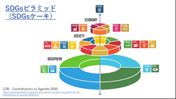 今回のワークショップでは、「SDGsの目標の中でも、環境問題をテーマにしたい」と、菊池さんは話した。その理由として、SDGsピラミッド(SDGsケーキ)という概念を紹介。