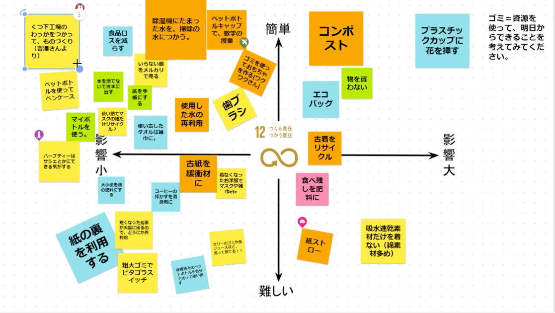 スウェーデンの事例を踏まえ、「『ゴミ=資源』という考えを使って、明日からできることを考えて見よう!」というテーマでワークショップを行った。東京都小金井市立前原小学校の蓑手章吾先生もワークショップのファシリテーターとして参加した。参加者の意見は、複数人の考えや意見を付箋に書いて編集できる「Jamboard」を用いて、すぐに共有した。