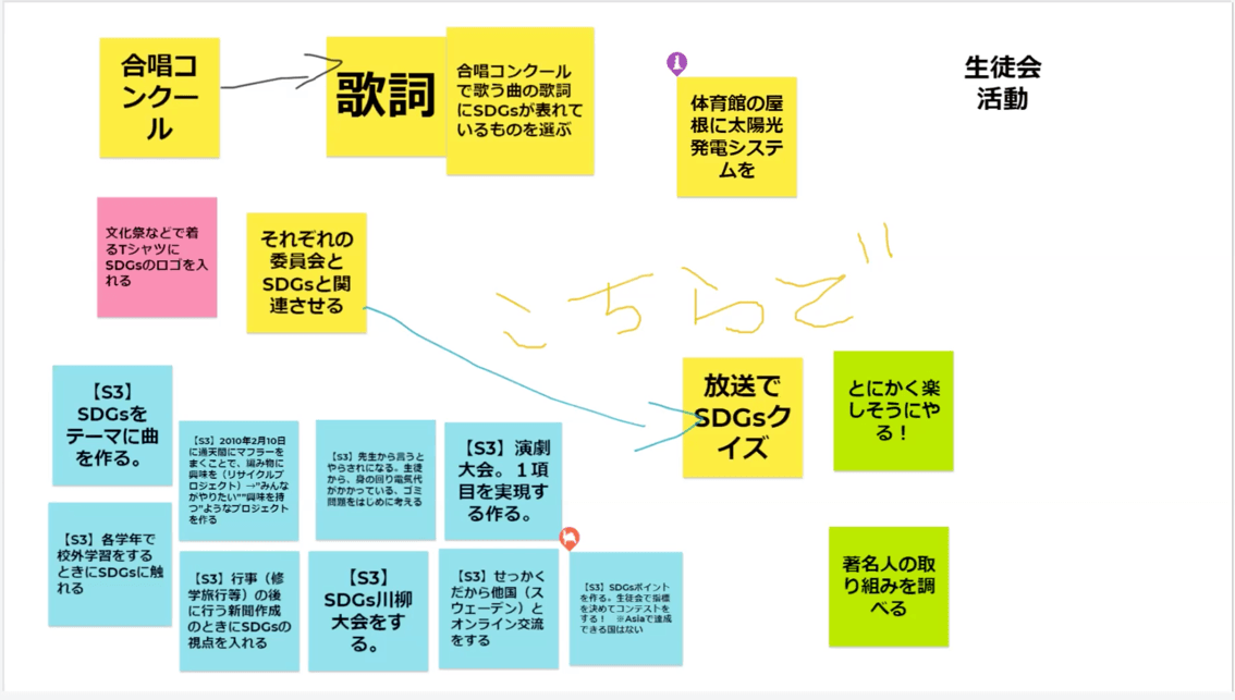 次に、「もし生徒会の一員であれば、あなたは学校でどのような取り組みをしますか?」をテーマとして、「Zoom」のブレイクアウトルームの機能を用い、4〜5人のグループに分かれ、10分間でテーマについて意見を出し合った。各チームからは、次のような意見が挙がった。