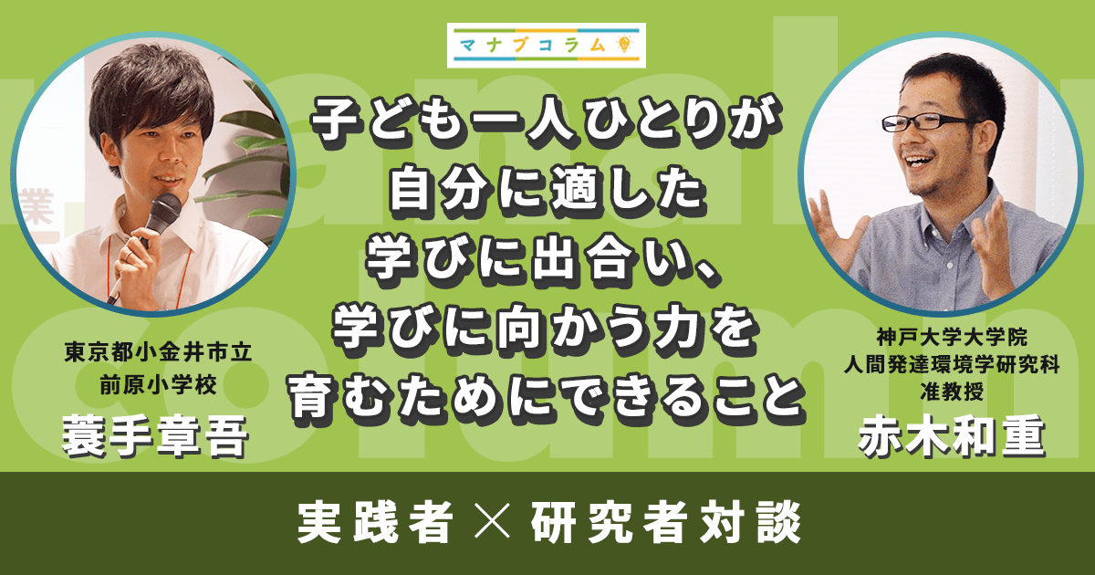 子どもが自分に適した学びを獲得し、自ら学び続けていくためには、どのような手立てが必要なのか。コロナ禍においてもICTを活用して子ども主体の学びを止めなかった東京都小金井市立前原小学校の蓑手章吾先生と、発達心理学が専門の神戸大学大学院の赤木和重准教授が、蓑手先生の実践を基に、個別最適な学びを実現するポイントを語り合った。