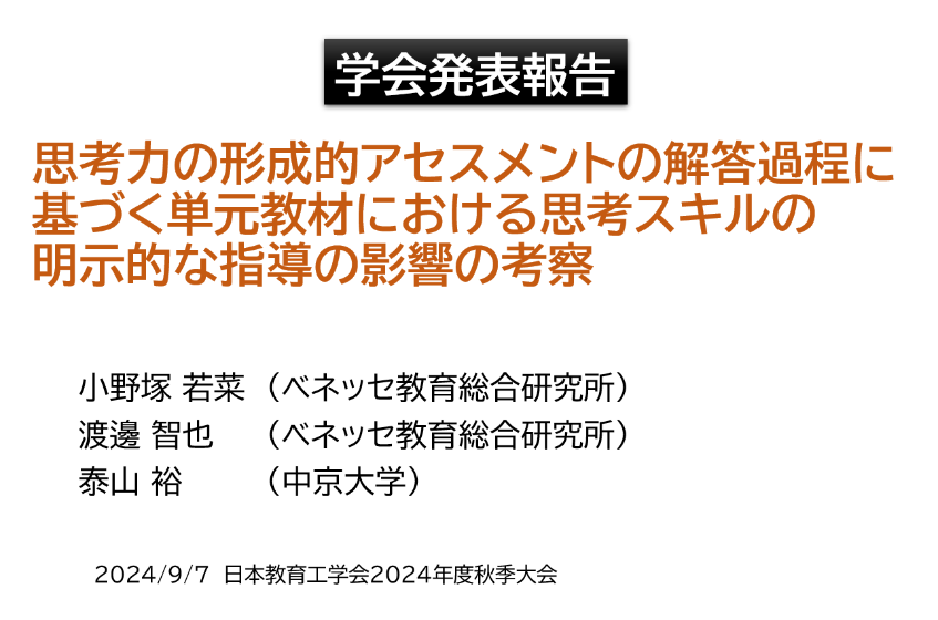 【学会発表報告】日本教育工学会2024年度秋季大会「思考力の形成的アセスメントの解答過程に基づく単元教材における思考スキルの明示的な指導の影響の考察」