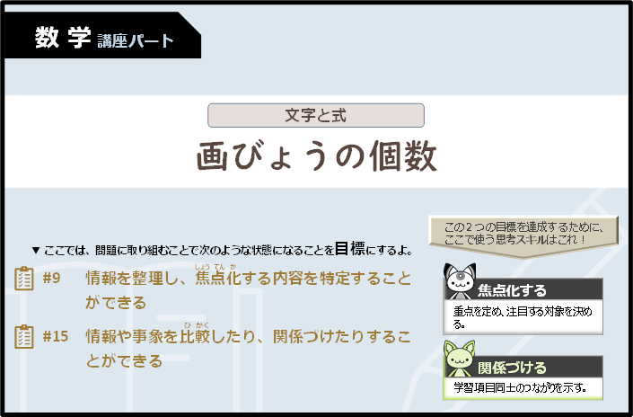 設問の段階で考える手段として思考スキルが表示されるため学習者はそれをヒントに解答し,また解答後の解説部分にも再び思考スキルが明示され,その問題の文脈に沿った考え方が示されます。このような構成の指導パートによって単元内容とともに問題解決に用いる思考スキルの適用方法の理解を促します。確認テストは指導パートの後に行い,思考スキルを適切に適用して設問に解答できるかを確認します。