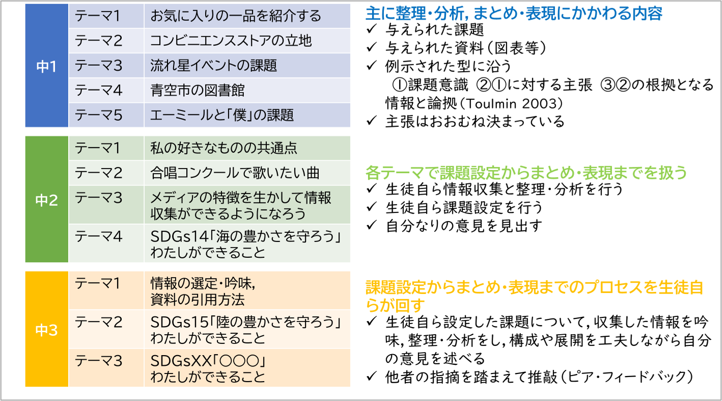 図3に示したように,中1単元では主に整理・分析,まとめ・表現にかかわる内容を扱っています。与えられた課題について,与えられた資料に記載された客観的な根拠を示しながら,例示された型(①課題意識,②①に対する主張,③②の根拠となる情報と論拠,という構成)に沿って,相手に伝わりやすい文章を書けるようになることを重視しました。それに対して中2単元では,課題設定からまとめ・表現までを各単元の中で広く扱いました。中1の指導に加え,課題設定,情報収集,整理・分析を生徒自らが行えるようになることや,自分なりの意見を見いだせるようになることを重視しました。中3単元ではさらに,課題設定からまとめ・表現までの探究の4つのステップを自ら回せるような探究的な課題を生徒自ら設定し,その課題について収集した情報を吟味した上で整理・分析し,構成や展開を工夫しながら自分の意見を述べることを目指しました。また,ピア・フィードバックを複数回行い,他者の指摘を踏まえて推敲できるようになることを重視しました。なお,各学年のテーマごとのさらなる詳細は,小野塚・藤井・鈴木(2024)を参照してください。