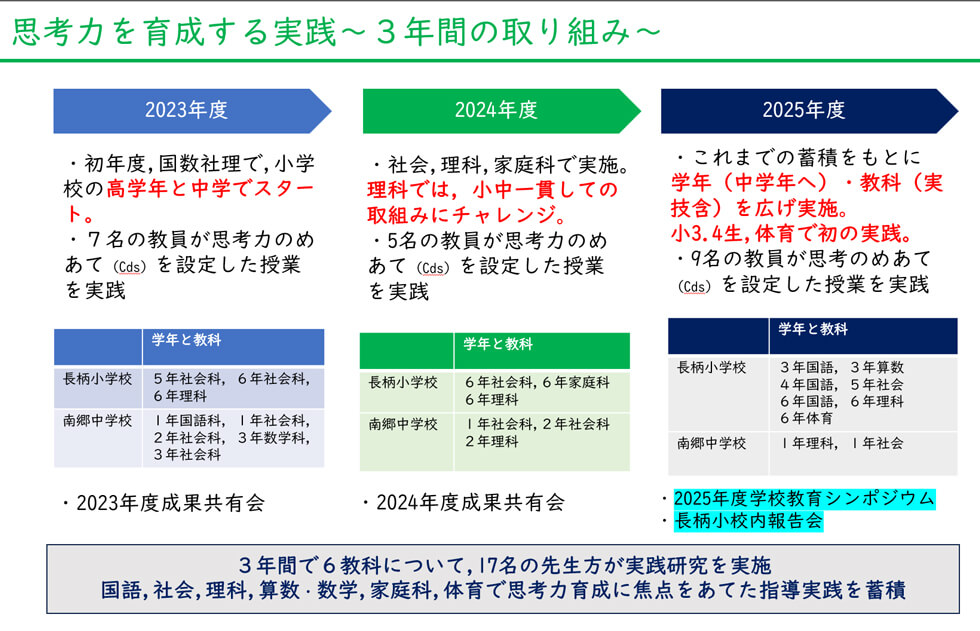 本共同研究は,2023年度に小学校高学年及び中学校でスタートし,2年目には小中一貫しての取り組みに挑戦。最終年度(2025年度)は,小学校中学年や体育などの実技教科へと対象を広げ,多くの教員がCdsを用いた共同実践研究に参加しました(図1)。