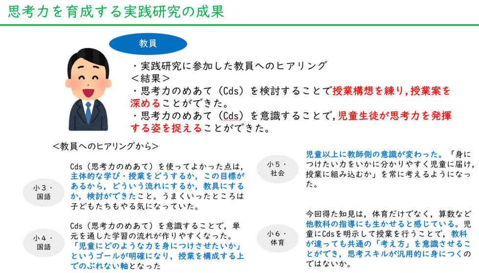 授業を実践した教員にどのような成果を実感しているかをうかがうと,「授業のねらいが明確になった」など,授業改善が進んだことが挙がりました。長柄小学校の水木裕介先生は,「Cdsを用いることで,『この学習でどのような思考力が育つのか』などと意識して,授業づくりができました」と語りました。教員4年目で日々授業改善の視点を大切にしているという南郷中学校の川上緑夏先生は,「授業づくりの過程でCdsを参照してどの思考力が育つのかを確認し,『この思考スキルは意識していなかった』といった様々な気づきや学びがありました」とふり返りました。