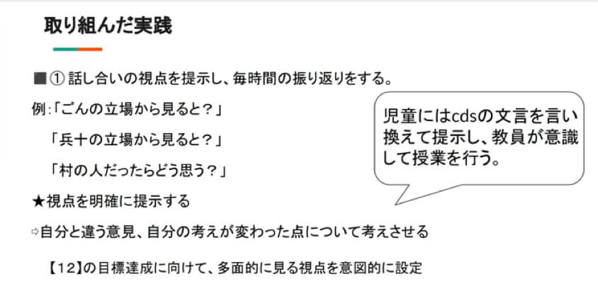 「ごんぎつね」を通じ,登場人物の複雑な心情変化を叙述に基づいて読み解く力の育成を目指しました。授業目標は5つのCdsとし,中でもCds#12「多面的に見る」を重点目標に設定。児童の発達段階を考慮し,Cdsを児童が理解しやすい言葉に変換してめあて(授業目標)に組み込みました(図3)。