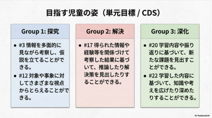 Cdsは,学習のねらいとしてだけでなく,学習者のふり返りにも活用することができます。Cdsを手がかりに授業をふり返ることで,学習者は単元の内容だけでなく,学習を通じて自分がどう考えたのか,どのように学習を進めてきたか,メタ的に捉えられるようになります。これにより,問題解決の際にどのような考え方・アプローチが有効かを理解しやすくなり,学習の進め方を自ら調整できるようになることを目指しています。