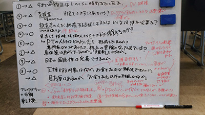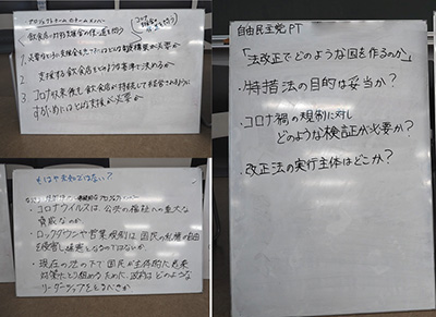 まずは記事を読み、プロジェクトチームの立場になりきって、質問を出し合った。「見直すべきコロナ特措法の内容は何か?」「『憲法上の整理』とは、何条ですべきか?」「ロックダウンする基準は何か?」など、ホワイトボードに次々に書き込まれていく。