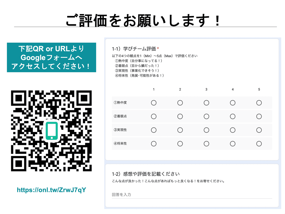 図1 各チームのプレゼンテーションは、4つの観点を5段階で評価。自由記述欄には、よかった点やもっとよくなる点などを入力して送信した。
