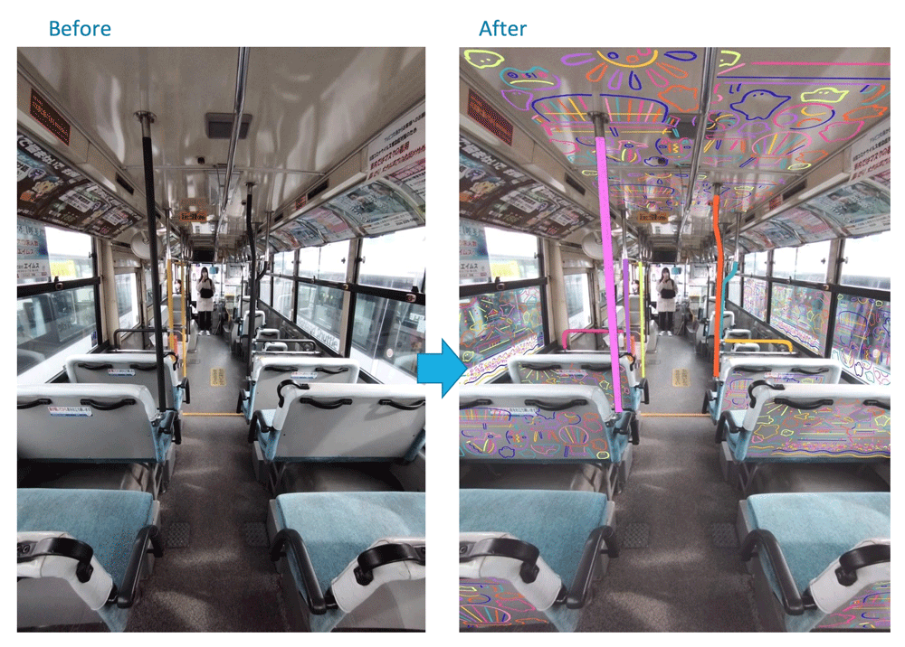図2 バスの内装をイメージできるよう、美大生が提案するデザイン案を提示した。