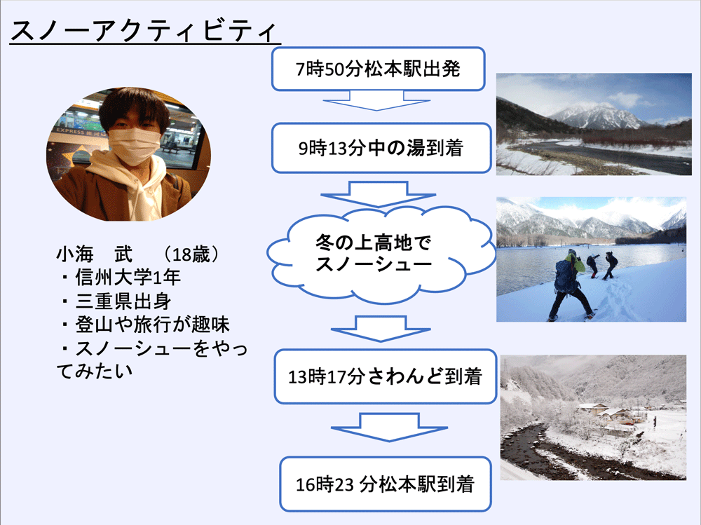 信州大学生対象のアンケートでは、松本からバスが出ている上高地や高山を訪れたことがない学生が約7割いたが、乗車パスポートを半額以下にすれば利用したいという学生が7割以上いた。その調査結果を基に、アルピコ交通が販売する「信州・飛騨アルプスワイドフリーパスポート」を学生向けにリニューアルする。乗車パスポートを利用した観光プランも併せて提案した。