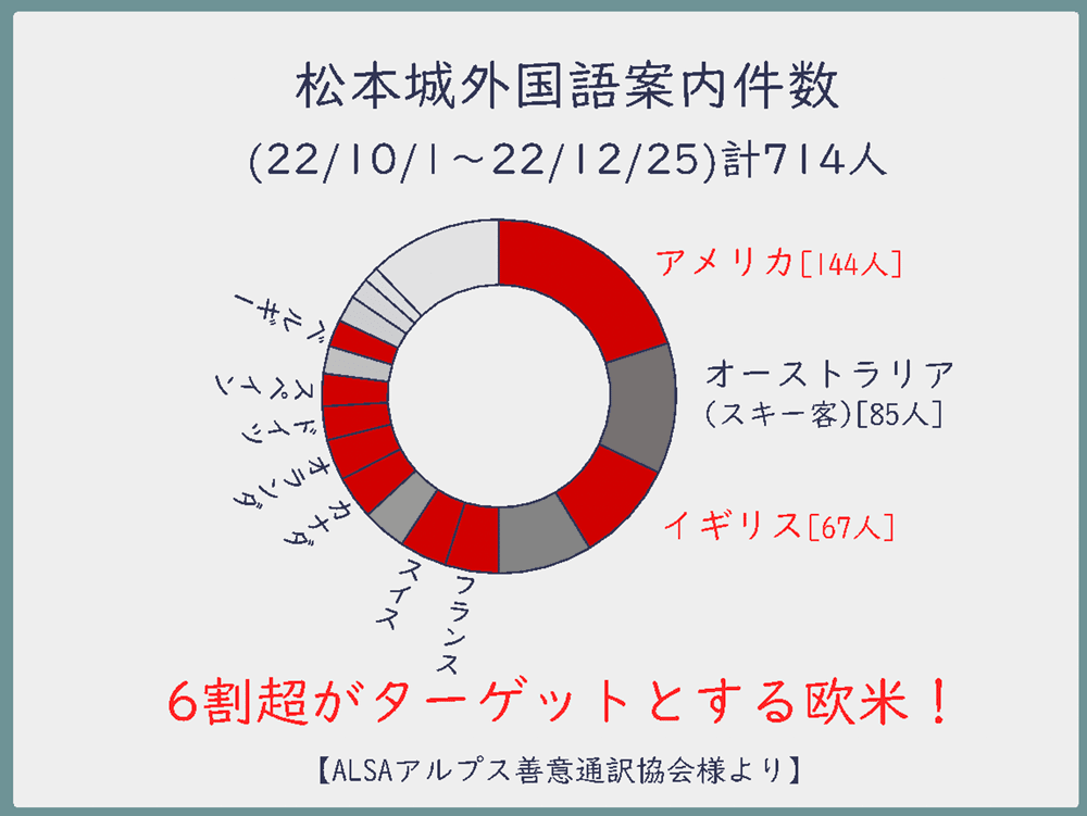 図4 松本城での外国語の案内件数から、個人旅行では欧米の観光客が多いことが分かった。