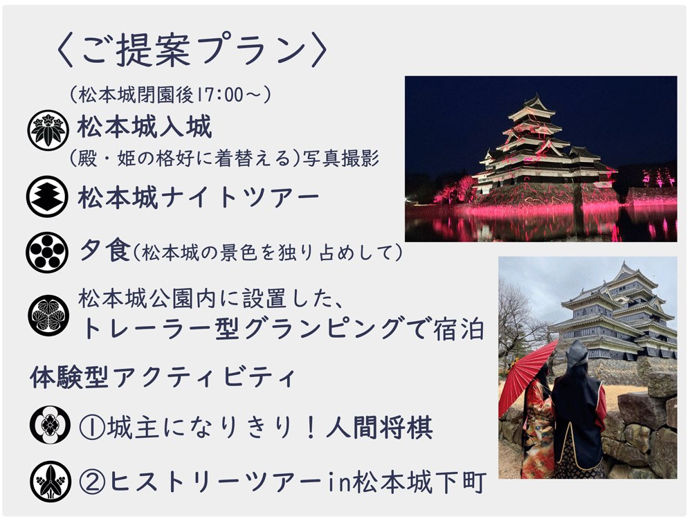 欧米の富裕層は、日本文化や歴史への知的好奇心が高いと分析し、付加価値の高いプランを設定。具体的には、殿様やお姫様気分を味わえるよう着物に着替えた後、松本城のナイトツアーに参加。夕食は殿様御膳(当時の殿様の食事を現代版にアレンジした地元食材を使用した食事)を用意し、宿泊は松本城公園内に設置したトレーラー型グランピングとした。翌日は、人間将棋ゲームや松本にまつわる歴史ツアー(謎解きやそば打ち体験)など、地域住民と触れ合う体験型アクティビティーを用意。欧米の富裕層の宿泊により経済効果が期待できるほか、松本城周辺の観光促進につながる。