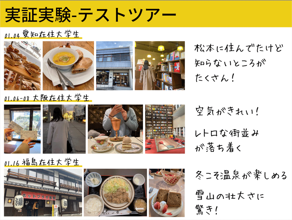 信州大学の1年生約2,000人のうち7割が県外出身者であること、松本には若い世代の観光客が少ないことがデータから明らかになった。そこで、1年生が出身地の友人を1人ずつでも松本に招待すれば、本人と友人とで年間4,000人の観光客が見込めると仮説を立てた。しかし、学内でのアンケート調査では、「松本って何もない」といった意見が多く、松本の魅力を知らないため、実際に友人を呼ぶ学生は少ないことが分かった。その結果を踏まえて、1年生に「2000人が推せる#(ハッシュタグ)を探す授業」を実施。「カフェ」「芸術」「湯めぐり」など、9つのテーマから1つを選び、テーマに合った店舗や施設を訪れ、友人に勧めたい松本を見つけるフィールドワークを行う。例えば、「芸術」をテーマに選んだ場合、美術館やギャラリーを訪れ、訪問先で出会った好きなものや興味深いものを撮影してSNSに投稿。相互評価を行い、評価の高い投稿をした学生に温泉券などをプレゼントする。フィールドワークでの交通手段には、アルピコ交通の1日乗車券「松本周遊バス『タウンスニーカー』」を利用。学生がバスを利用するきっかけにする。そして、数々の投稿を基に、松本市のデジタル観光マップを作成。アルピコグループの新人社員も一緒に地図を作成し、若者に人気のスポットなどを把握する機会とする。