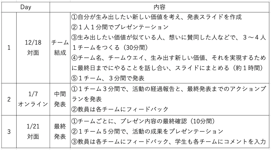 授業は、1日目にチームづくり(写真1)、3週間後の2日目にオンラインによる中間発表、その2週間後の3日目に最終発表が行われた。授業自体は3日間だが、チーム結成から約1か月間で、計画を立て、実行し、発表までを行うため、授業時間外での活動が必須、というより、それが学びのメインとなる。