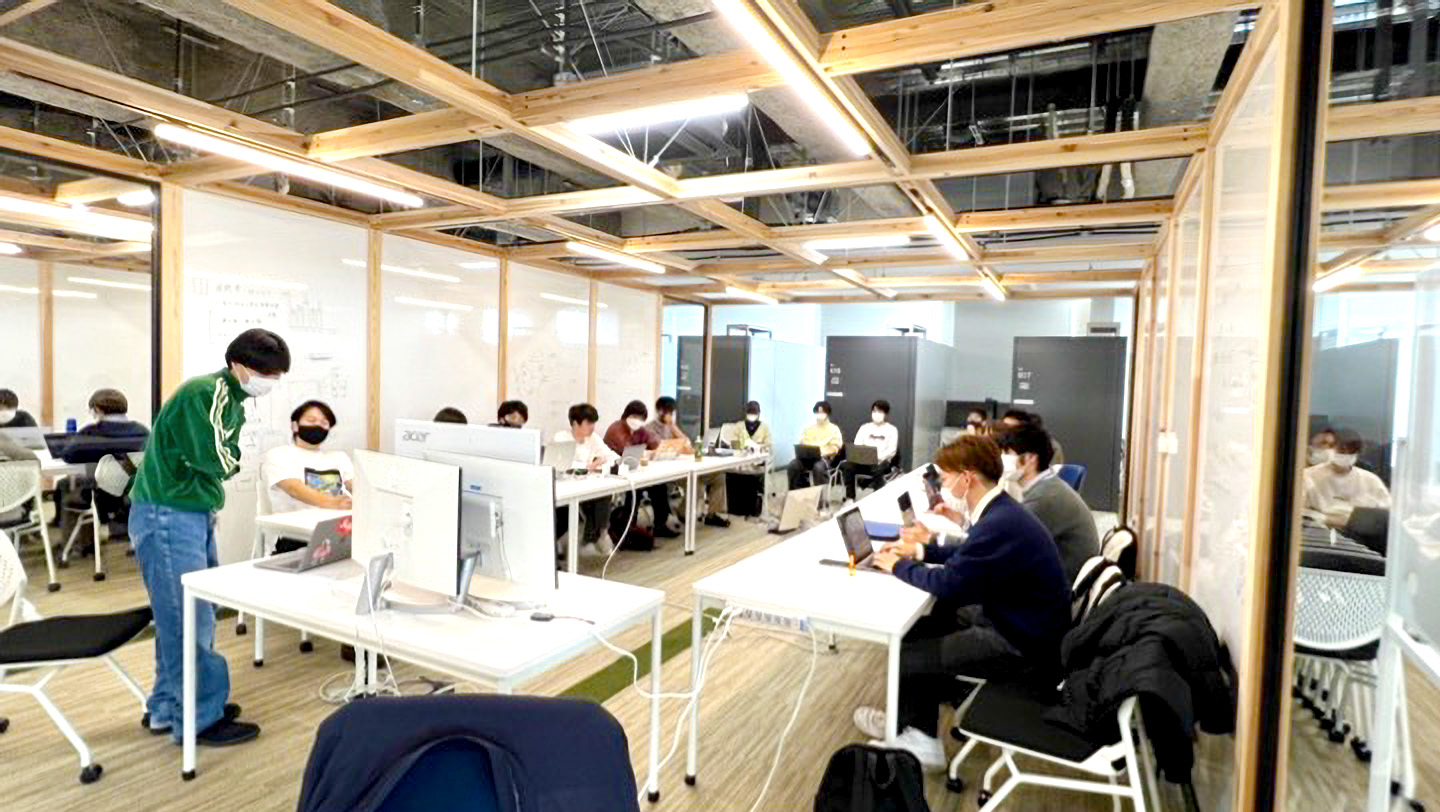 写真1・2 学生が集う学部専用の研究エリア。壁のないオープンなつくりが特徴だ。各プロジェクトグループが集まるエリアは決まっているが、学生はグループを超えて自由闊達に議論している。