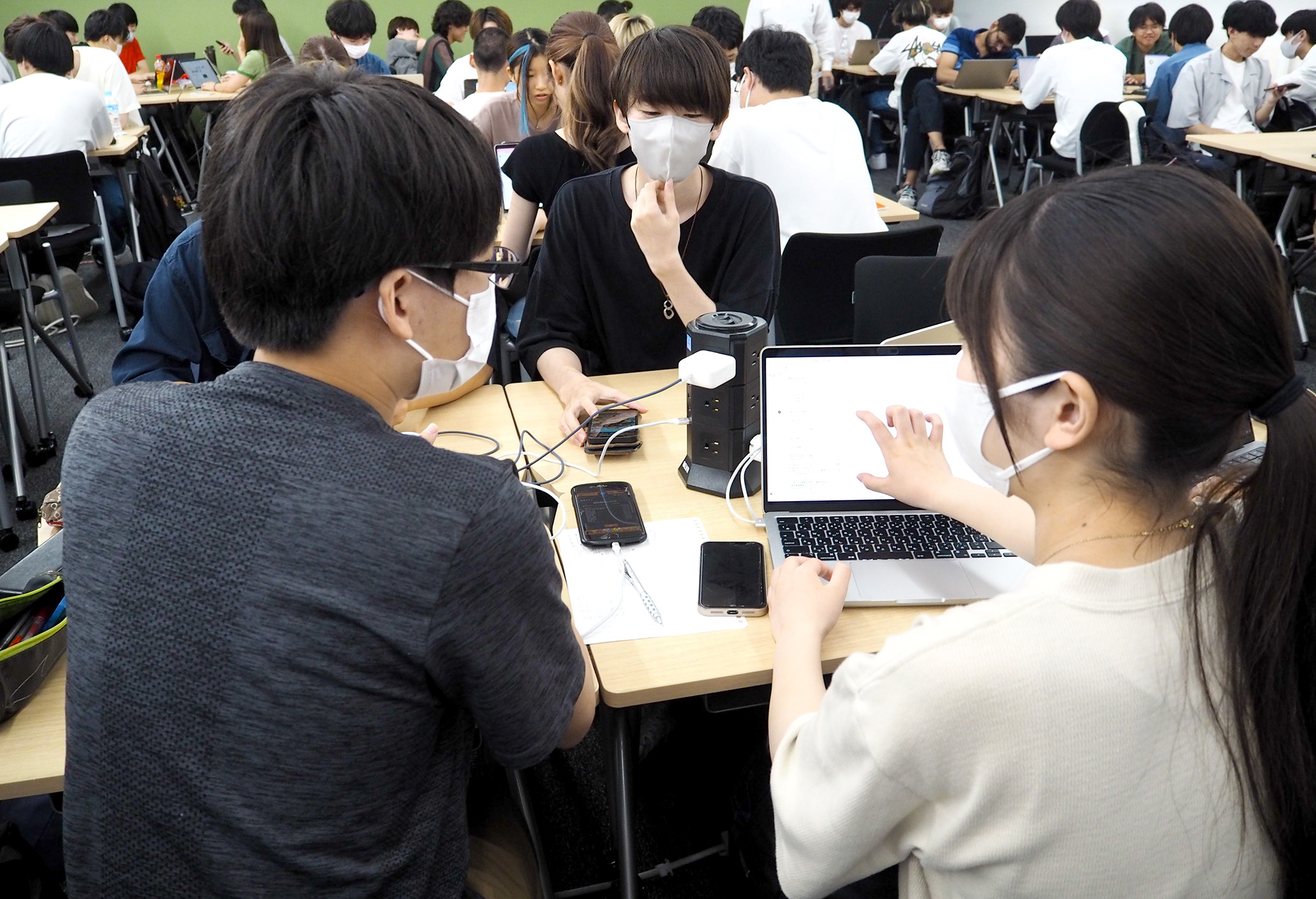 「未来創造プロジェクト」以外の科目も、1年次から実践中心の授業を構成しています。教員が一方的に話す講義型の時間を抑え、個人やグループで課題に取り組む時間を増やしています。さらに、すべての専門科目で、毎週課題を課して評価しています。本学部の学生の授業外学習時間は月平均100時間超で、全学部の中でトップです。