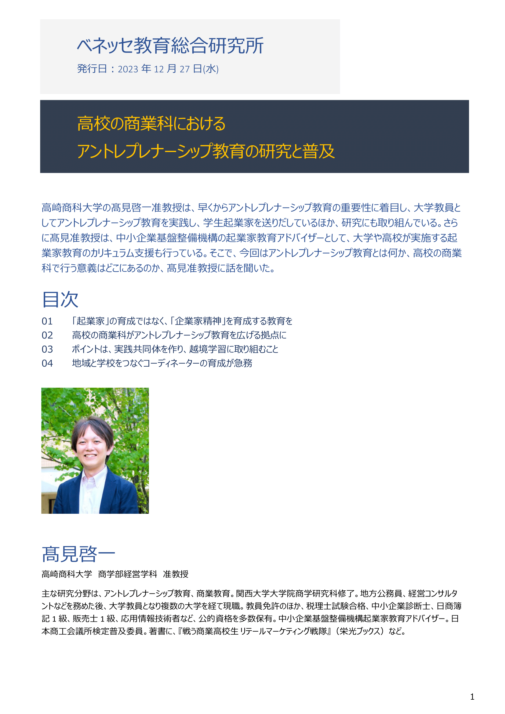 高崎商科大学の髙見啓一准教授は、早くからアントレプレナーシップ教育の重要性に着目し、大学教員としてアントレプレナーシップ教育を実践し、学生起業家を送りだしているほか、研究にも取り組んでいる。さらに髙見准教授は、中小企業基盤整備機構の起業家教育アドバイザーとして、大学や高校が実施する起業家教育のカリキュラム支援も行っている。そこで、今回はアントレプレナーシップ教育とは何か、高校の商業科で行う意義はどこにあるのか、髙見准教授に話を聞いた。