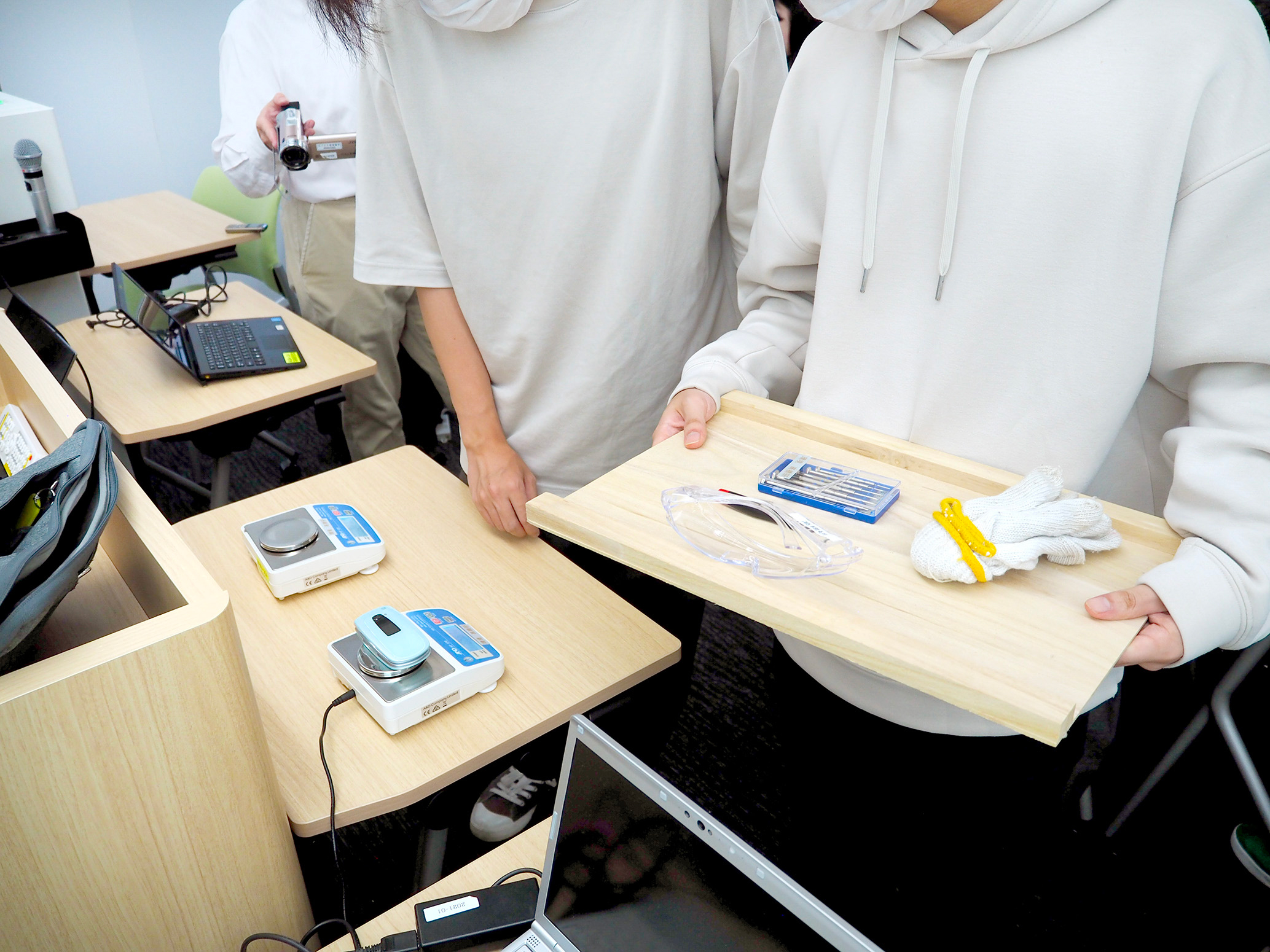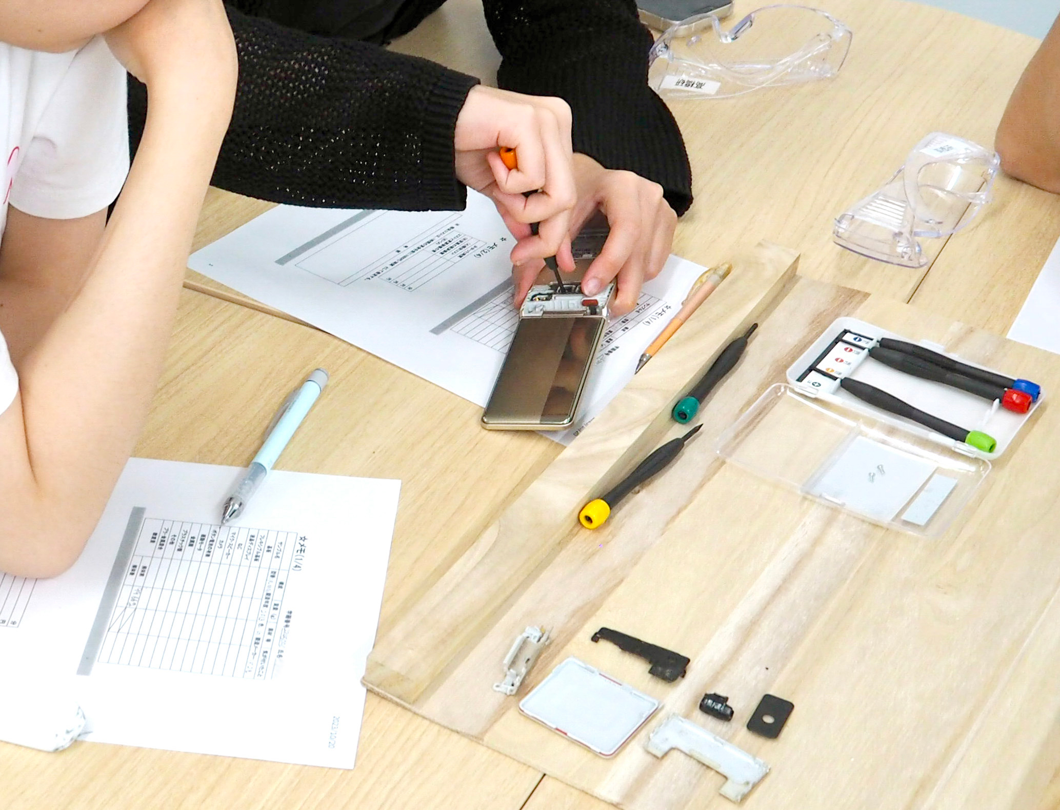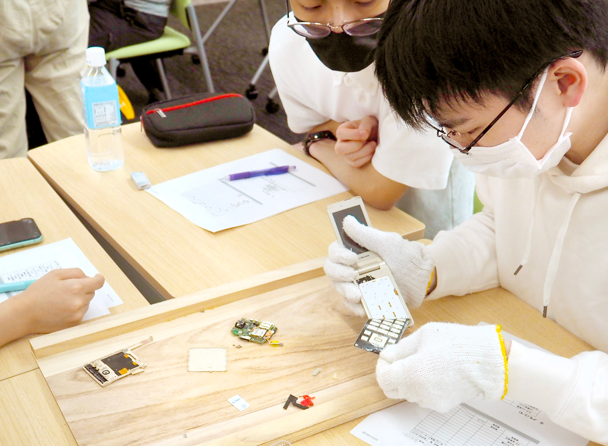 髙橋教授から解体の手順の説明を受けた後、学生は4〜5人1組となり、携帯電話や精密ドライバー、安全のための保護メガネと軍手を受け取った(写真1)。そして早速、解体に取りかかった。