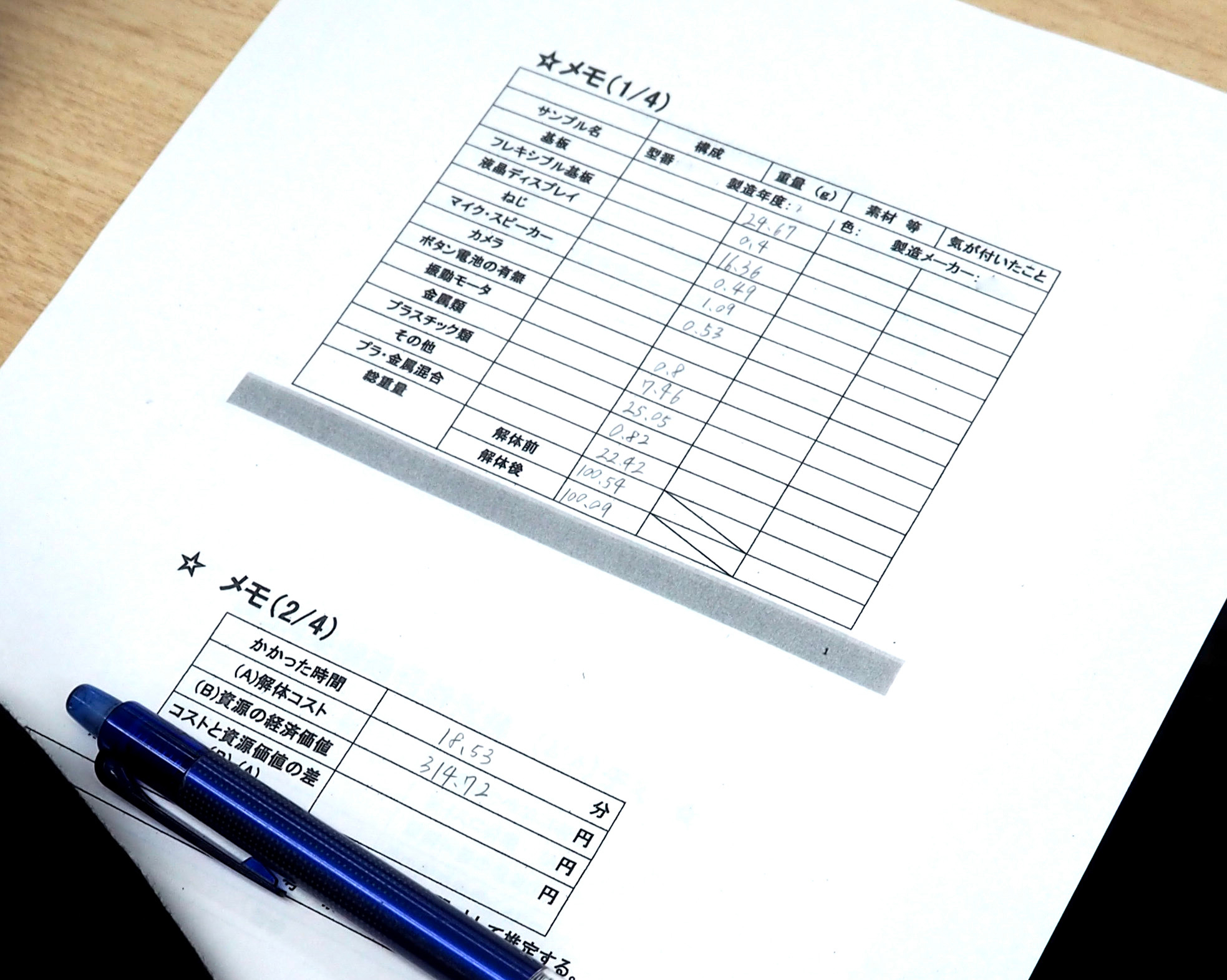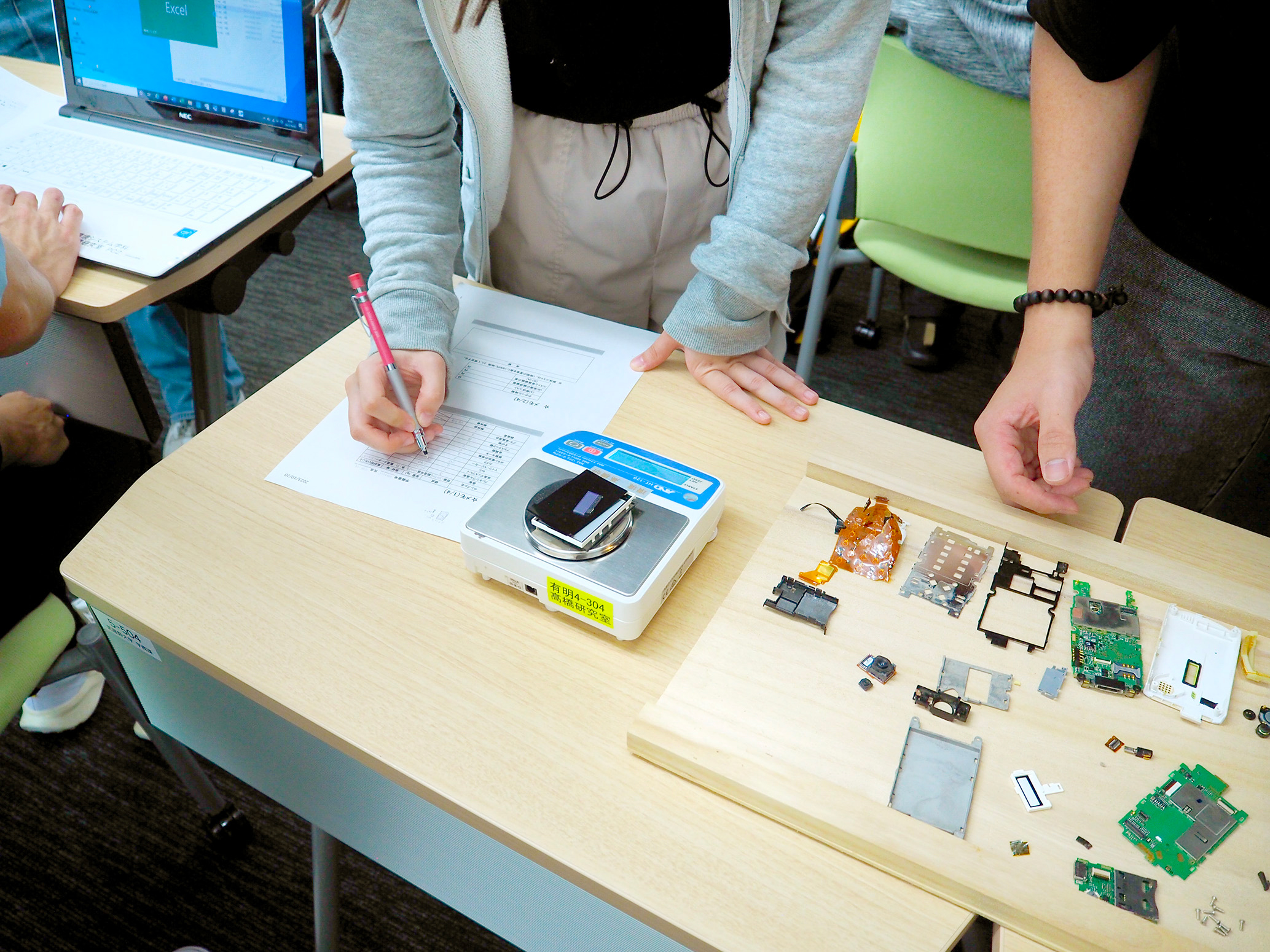 写真7 約100グラムの携帯電話の内訳を実測。「(基板は)一つひとつが重い」「(フレキシブル基板は)薄くて軽い」「(プラスチックは)点数が多い」などと、気づいたことをワークシートに書き込んだ。