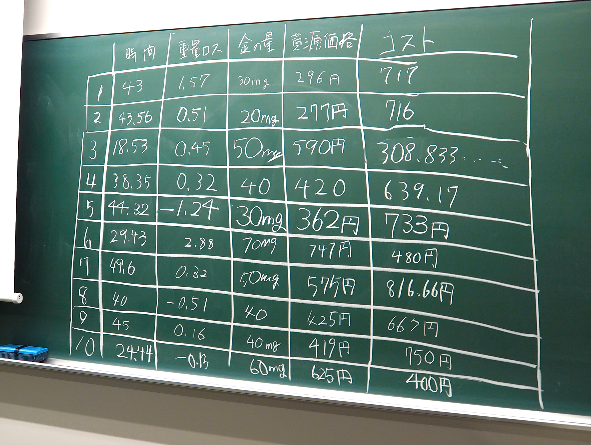 写真8 解体にかかった時間、重量ロス(解体前の重さ−解体後の部品の総重量)、金の含有量、資源価格、コストを、各グループが記入。資源価格が解体コストを上回っていたグループは全10グループ中3つだった。