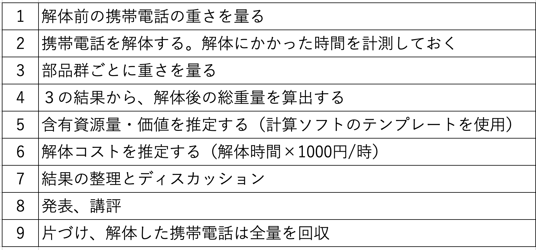 携帯電話はどのような材料からできていて、それぞれの材料の機能やその希少性を調べるなどの内容を学んだ上で、携帯電話を解体し、プラスチックや金属、ガラスなど、複数の材料が組み合わせられていることを自分の目で確かめる。さらに、部品を材料ごとに分別し、量を推定するとともに資源としての価値を算出する。解体コストとの比較をすることで、リサイクルの意義や課題を理解する。そして、材料やリサイクルに対する自身の考えを深めた上で、どのようなリサイクル方法があればよいのかを検討するという流れだ。