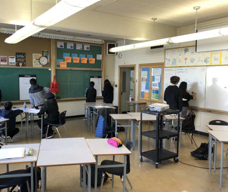 私は、カナダの公立高校で数学教員として働いています。私が授業で実践しているのは、 “Thinking Classrooms”です。これは、カナダのピーター・リリヤドール(Peter Liljedahl)教授が提唱している教育理論で、単に問題を解くだけでなく、生徒同士がグループワークでコミュニケーションをとりながら問題を理解し、より深く考えることを目的としているものです。私のクラスでは、生徒は少人数のグループになり、ホワイトボードを使ってお互いの意見を交換し、グループで納得できる答えを見つけていきます。そのため、私が生徒に答えを直接教えることはありません。
