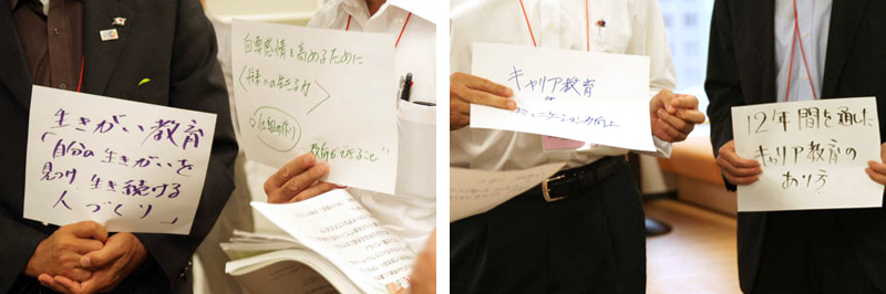 第1回ワークショップの最終プログラムは、小中高混成チームでのオピニオン作りでした。写真のように話し合いたいテーマをそれぞれ紙に書き、そのテーマが近い先生同士が集まって5つのチームを結成。「12年間を通したより良い学びのために、教師が出来ること」を、教師発のオピニオンとしてまとめ上げました。