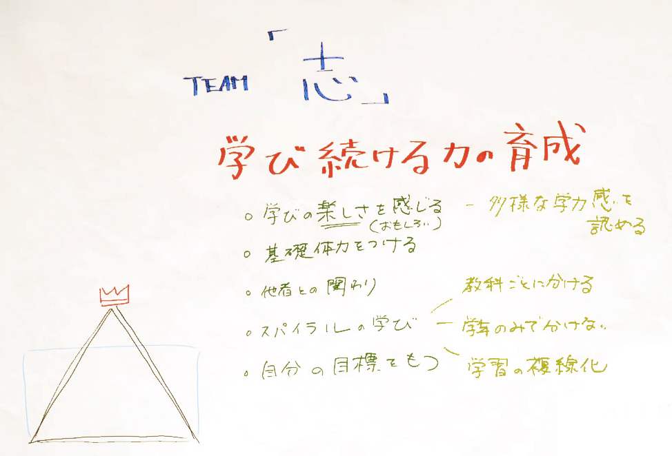 まず先陣を切って発表したのが、「チーム『志』」の先生方。12年間を通して「学び続ける力」を育成する指導の在り方について議論を深めました。