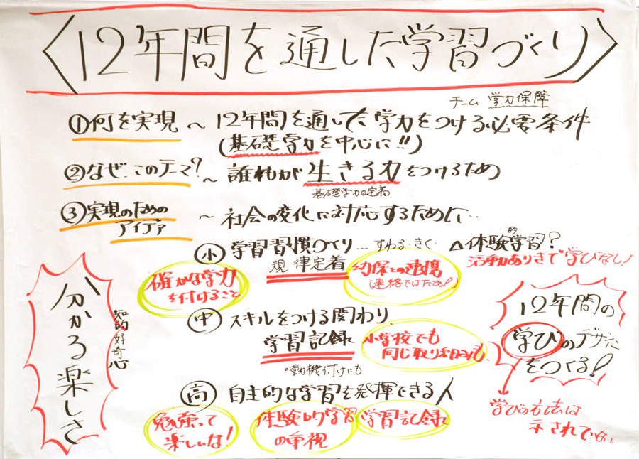 続いて発表したのが、「12年間を通した学習づくり」に焦点をあてた「チーム『学力保障』」。以下のように、小中高それぞれで行うべき、具体的な指導の在り方まで議論を深めました。