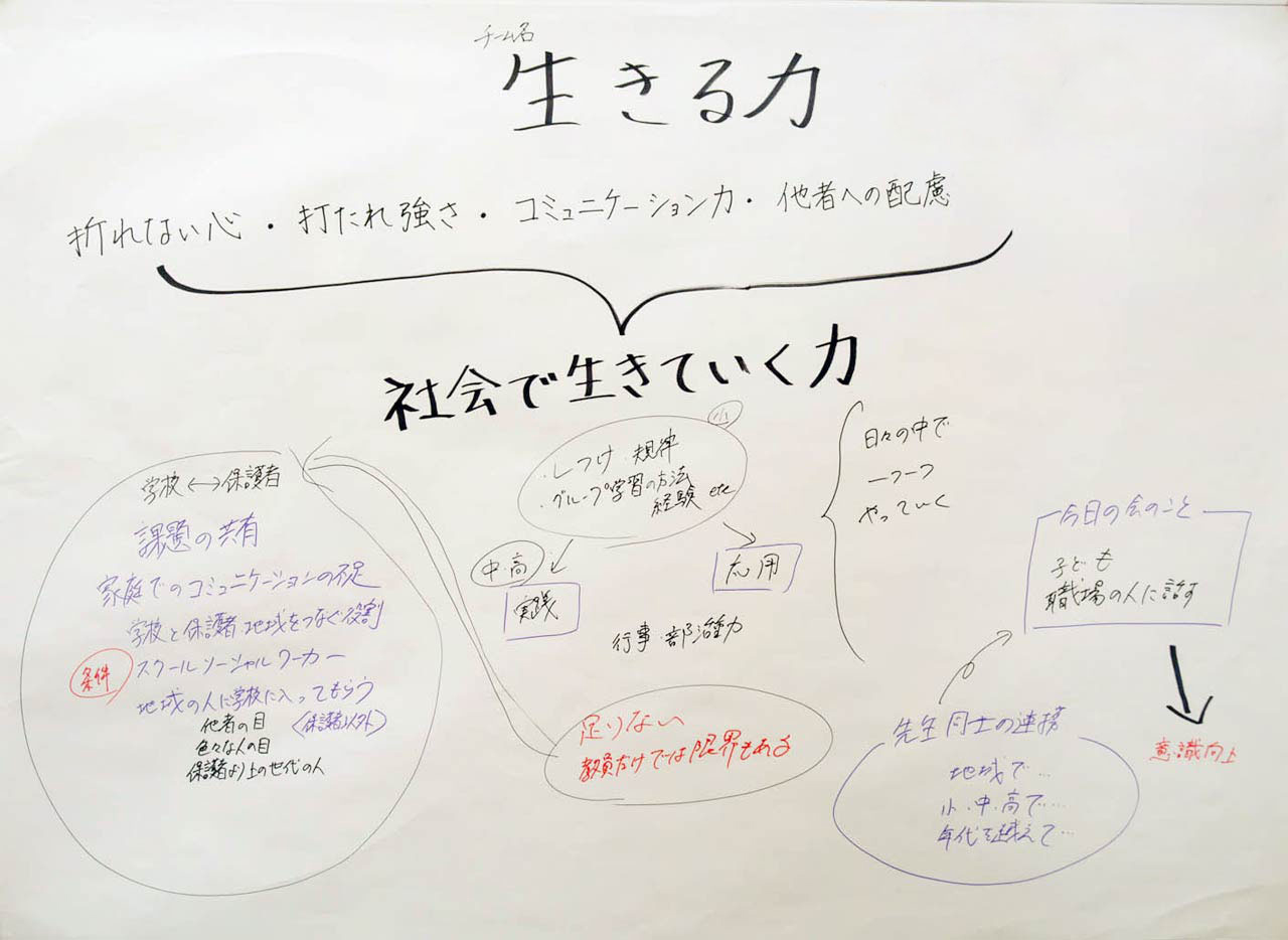 これからの子たちの将来を考えるにあたり、学習指導要領に掲げられた「生きる力」の意味を改めて問い直すところから議論したのがこのチーム。これからの「生きる力」を「社会で生きていく力」とした上で、「折れない心」、「打たれ強さ」、「コミュニケーション力」、「他者への配慮」の5つの力を、小中高を通じて系統的に育てていく方策について議論を深めました。