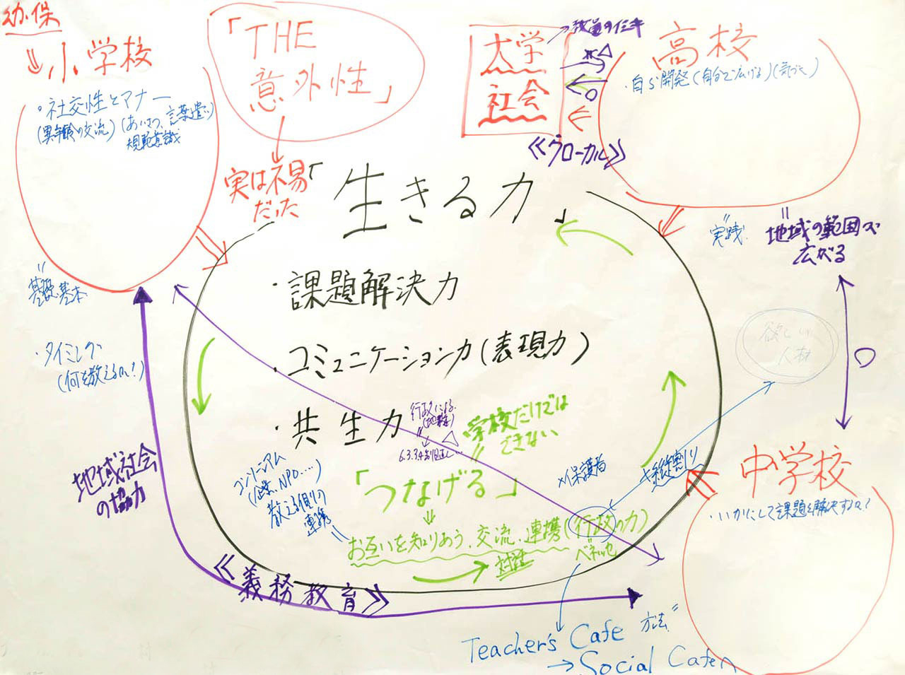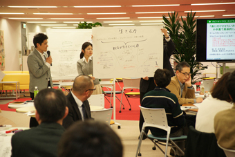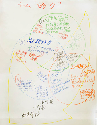 第1回ワークショップから、継続参加して下さった先生方がメンバーのこのチームは、それぞれの先生が提案した「コミュニケーション力」「課題解決力」「主体性、共生力」をキーワードに議論を深めました。結果、確認されたのは、アプローチの違いこそあれ、小中高で共通で向かうべき方向は「市民性の育成」という視点では一緒だということ。そして、それを育むためにも、学校種間はもとより、学校の外の社会とも連携を図っていかなければならないという点でした。