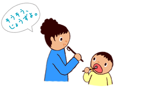 ※歯ブラシでのどをついてしまう危険がありますので小児用の、のどをつかない工夫をしている歯ブラシを利用しましょう。※仕上げみがき用の歯ブラシを子どもに持たせないようにしましょう。