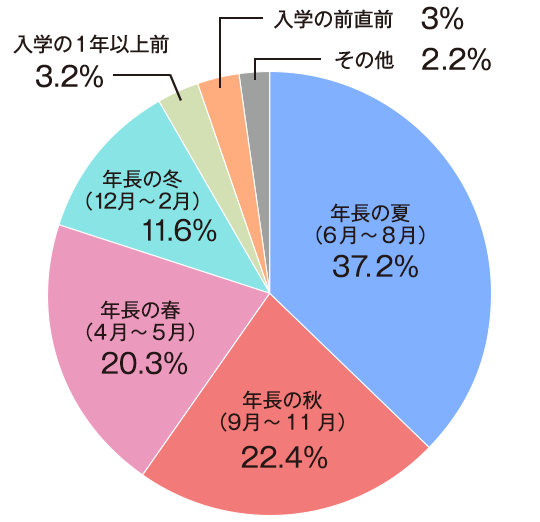 年長の秋以降、2月までが多い中、年長の4~5月ごろに前年度の商品を、入学直前の3月ごろにその年の商品をセールで購入するケースも。販売数の少ない工房系のランドセルや人気のデザインなどは、品切れになる前の早めの購入が多いよう。