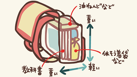 教科書や資料などの重いものは体の近く=背側に入れ、体操着袋や筆箱などの軽いものは外側に、