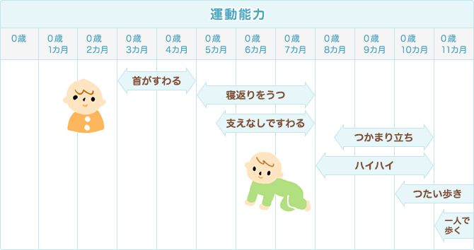 赤ちゃんの成長 図でみる赤ちゃんの発達の流れ 運動能力 ※発育・発達には個人差がありますので、目安としてご覧ください。 次へ » 発達の流れトップへ戻る 赤ちゃんのお世話・ふれあい遊び動画図で見る赤ちゃんの発達の流れ 母乳とミルクの疑問にお答え 健診 赤ちゃんの行事 赤ちゃんと外出や旅行 赤ちゃんの洋服選び 育児の考え方は昔と違う 赤ちゃんの予防接種 読み聞かせで育つこころ みんなの体験談