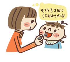 上手にゴックンと飲み込めるようになって、いやがらずに食事がとれていれば食事の回数を増やし、少し食感のあるかたさに進めてみましょう。- 1日2回