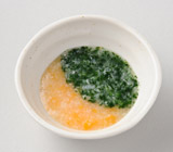 - ほうれん草、にんじんは別々に野菜スープでのばして、かゆにのせる。