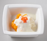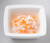 - 白身魚とにんじんに、ヨーグルトとオレンジジュースを混ぜたものをかける。