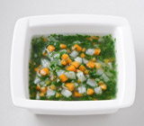 - だし汁にさといも、小松菜、水溶き片栗粉を混ぜて電子レンジで30秒加熱。さいの目に切った豆腐を加えてさらに20秒加熱し、小松菜をのせる。
