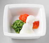- かぼちゃ、玉ねぎ、かぶを器に盛る。ヨーグルトと豆乳を混ぜ合わせてかけ、やわらかくゆでたパプリカをのせる。