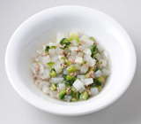 - 白身魚にだし汁を加えて混ぜ、かぶの葉をのせる。