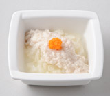 - かゆに、とり肉、にんじん、かぶの葉をのせる。食べる前によく混ぜ合わせる。