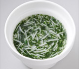 - そうめんは2cm長さに折り、やわらかくゆでる。鍋にだし汁、そうめん、青菜を入れてひと煮立ちさせる。